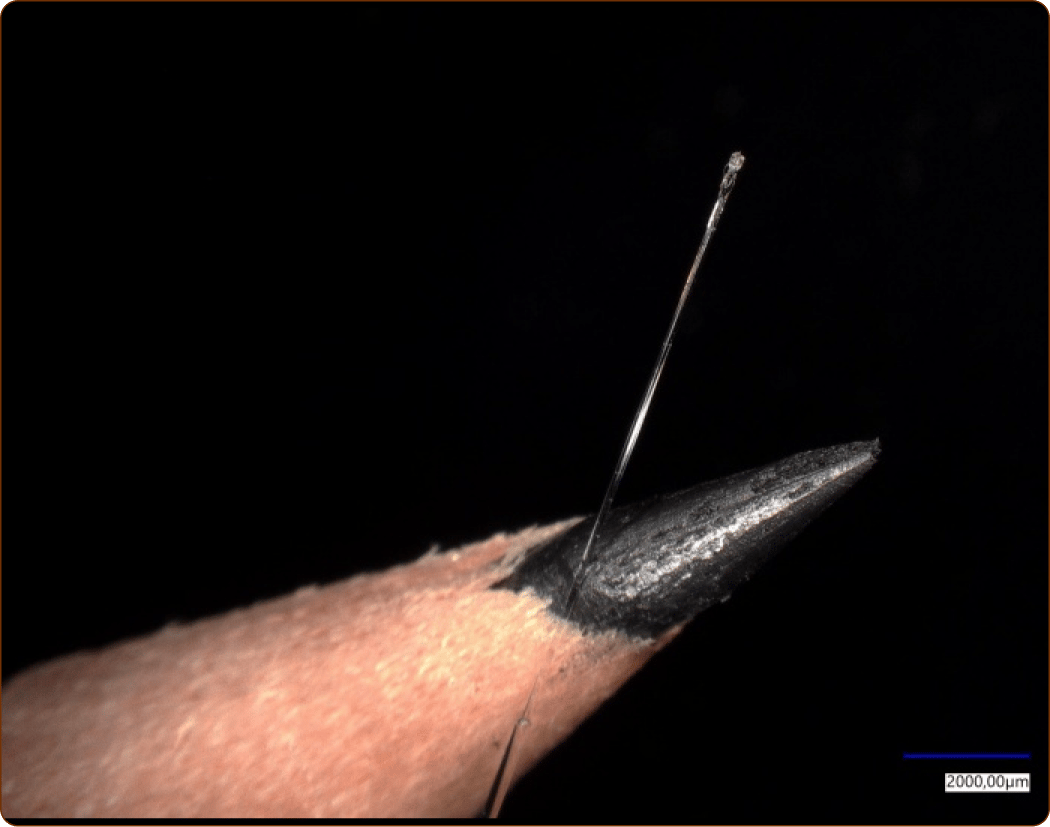 The researchers use a very thin optical fiber for 3D printing. The image shows the fiber in comparison to a pencil lead.Image: University of Stuttgart / ITO / Andrea Toulouse / Marco Wende